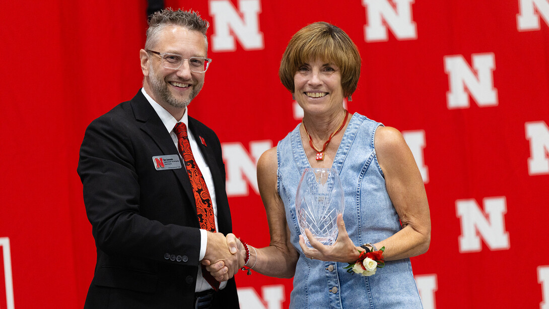 Larita Lang poses with Ben Lennander during the Service Awards ceremony on Oct. 30. Lang received a vase in recognition of her 45 years of service to the university.