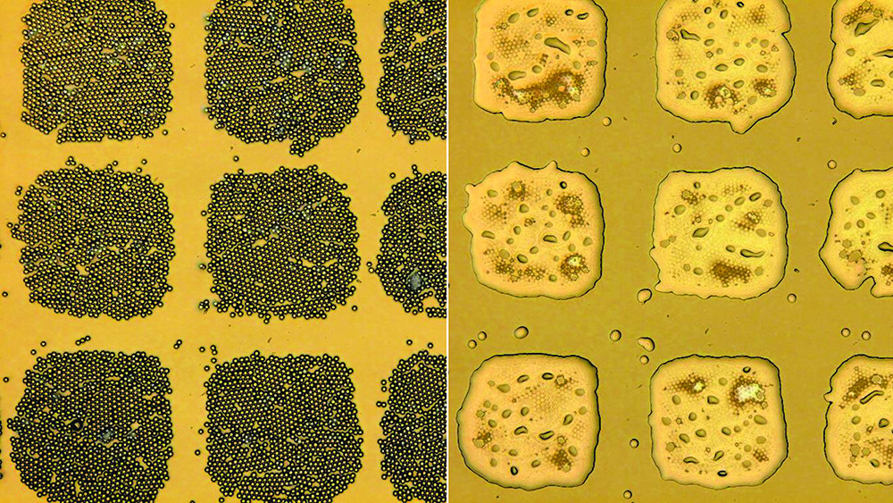 Yet the same study also found that multiple classes of crystals adhered strongly to the silicone surfaces under a variety of conditions, whether simply exposed to air or submerged in a solution. That insight informed a subsequent paper that outlined a method for depositing and merging islands of microscopic particles on silicone surfaces. The team began by stamping patterns of polystyrene particles onto the silicone. To do so, the chemists ensured that the stamp’s exterior featured an attraction strong enough to pick up the particles but weak enough to release them when contacting the silicone.