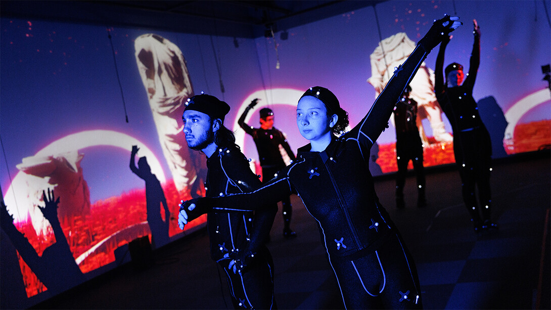 Isaiah Griffith (left) and Marley Hewitt, second-year students in the Johnny Carson Center for Emerging Media Arts, pose in motion-capture suits that will help transform them into animated characters on the surrounding screen.