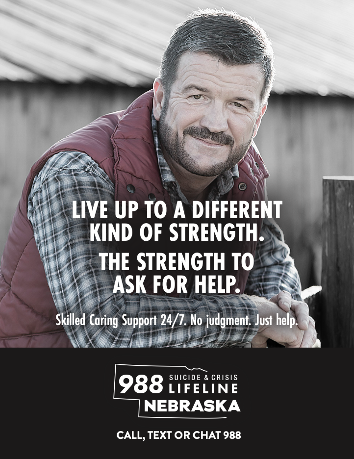 Across Nebraska, new suicide prevention posters are appearing with a simple, powerful message for rural men: “Live up to a different kind of strength. The strength to ask for help.” Featuring everyday men in familiar settings, the materials direct people to call, text or chat with 988, the Suicide and Crisis Lifeline.