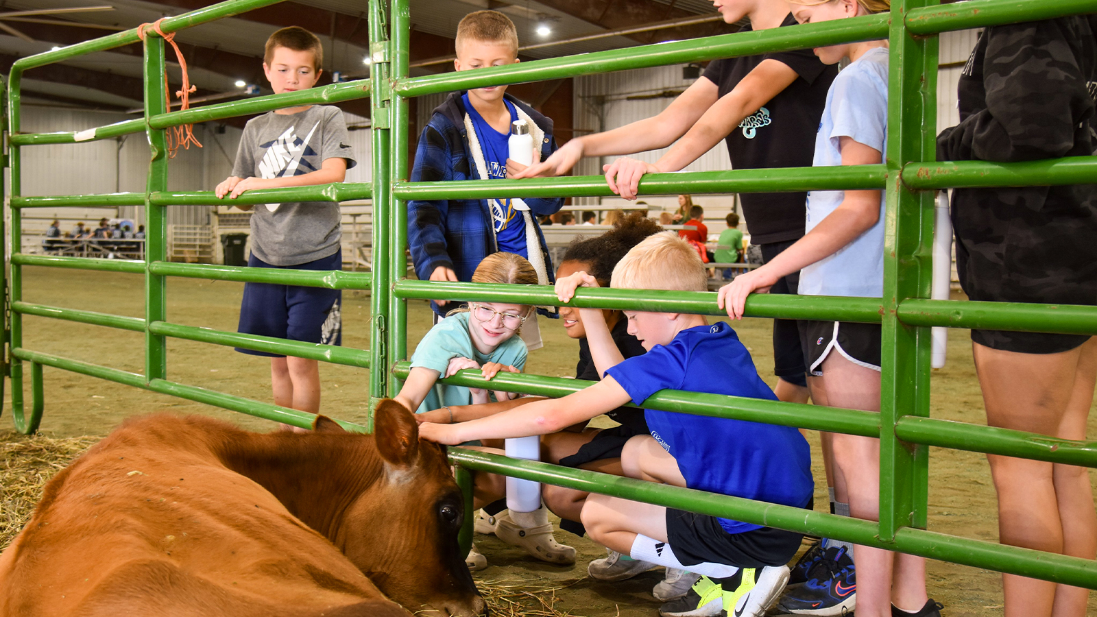 A group of fourth graders pets a curious calf through the fence during the 2025 Saunders County Ag Literacy Festival — part of a hands-on effort to cultivate connections between students and agriculture. Learn more at https://go.unl.edu/g4kd.