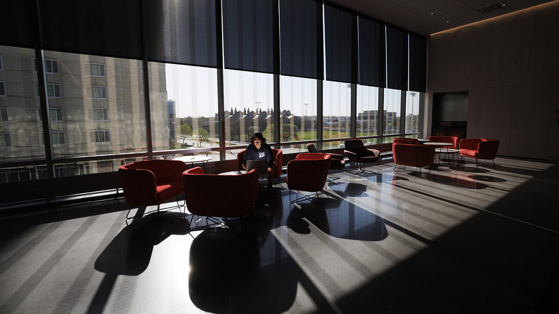 Afternoon sunshine and the architecture of Kiewit Hall mingle to form a bar graph of light and shadow as Alberton Rodriguez, a senior mechanical engineering major, studies for a statistics course.